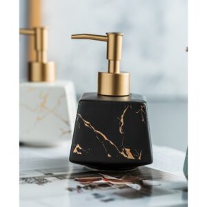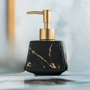 Thiết kế của bình đựng dầu gội, sữa tắm sứ vân đá CS04 mang lại vẻ đẹp hiện đại và tinh tế cho không gian phòng tắm. Bình có màu đen với bề mặt vân đá màu vàng, tạo nên vẻ sang trọng và đẳng cấp. Phần thân bình có thiết kế hình trụ với các góc cạnh sắc nét, tạo cảm giác thanh thoát và tinh tế. Nắp bơm được làm từ chất liệu kim loại màu vàng, tạo sự hài hòa và điểm nhấn cho sản phẩm. Sự kết hợp giữa màu đen và vàng kim tạo nên một tổng thể hiện đại, phù hợp với không gian nội thất đương đại.