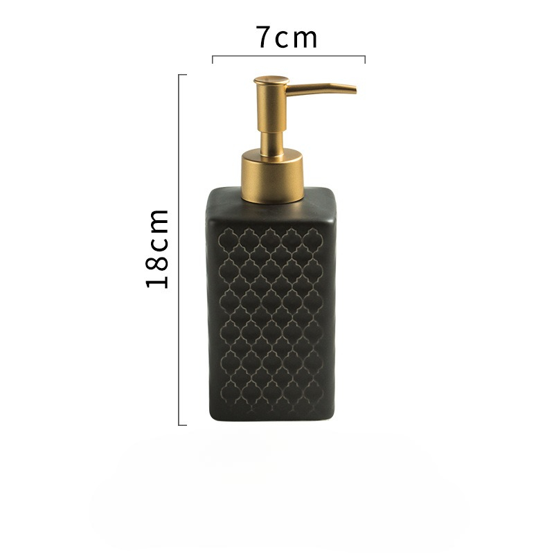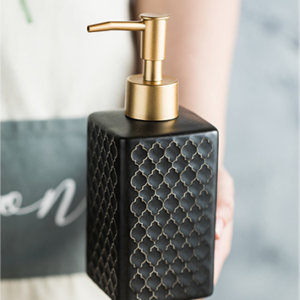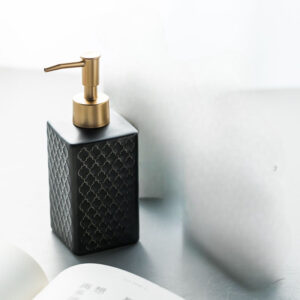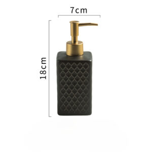 Thiết kế của bình đựng dầu gội, sữa tắm sứ vân nổi CS02 mang lại vẻ đẹp hiện đại và tinh tế cho không gian phòng tắm. Bình có màu đen với bề mặt vân nổi hình học độc đáo, tạo nên vẻ sang trọng và đẳng cấp. Phần thân bình có thiết kế hình chữ nhật với các góc cạnh sắc nét, tạo cảm giác thanh thoát và tinh tế. Nắp bơm được làm từ chất liệu kim loại màu vàng, tạo sự hài hòa và điểm nhấn cho sản phẩm. Sự kết hợp giữa màu đen và vàng kim tạo nên một tổng thể hiện đại, phù hợp với không gian nội thất đương đại.