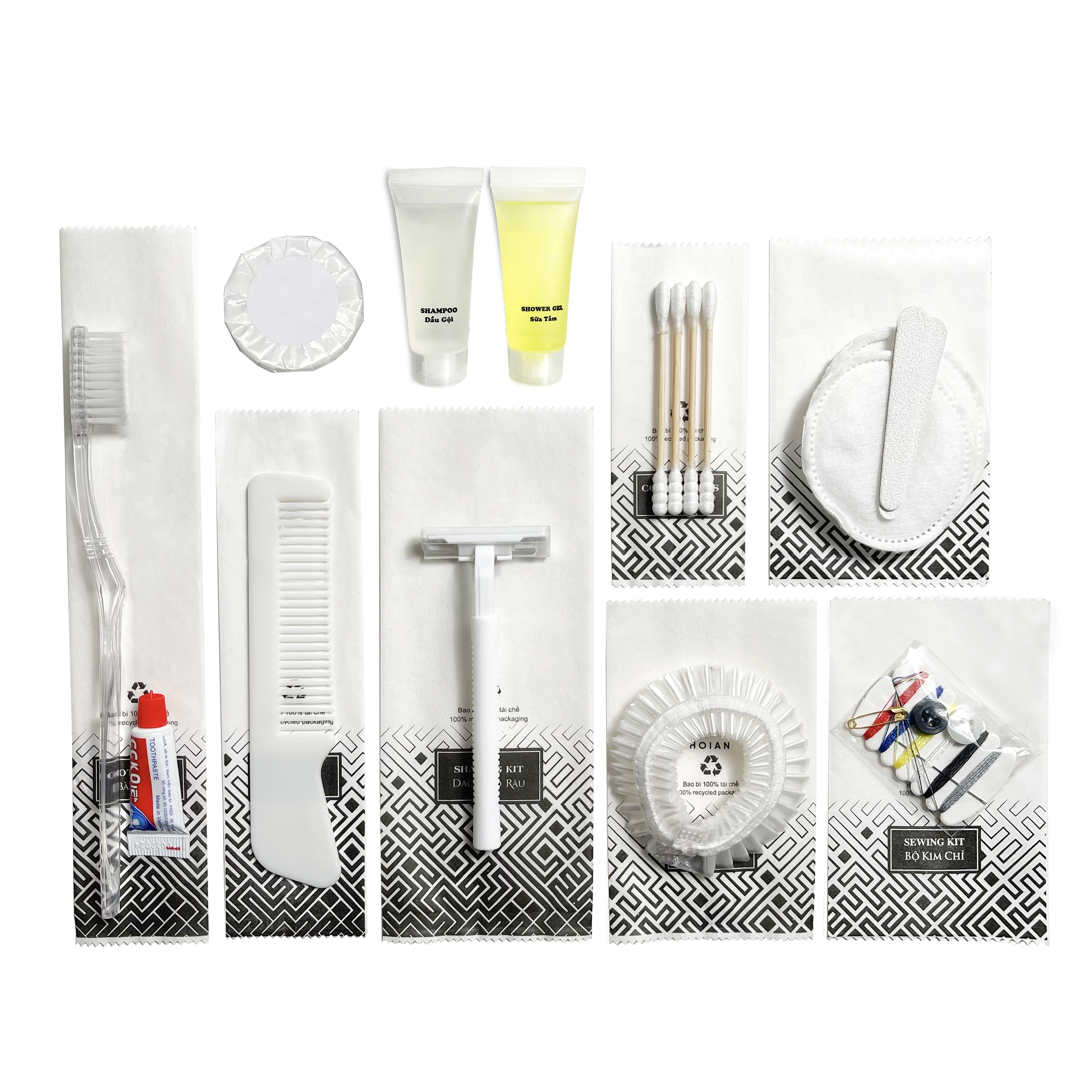 Bộ sản phẩm gồm mười món đồ thiết yếu, được đóng gói trong túi giấy trắng tinh tế, giúp khách hàng có đầy đủ vật dụng cá nhân cần thiết: