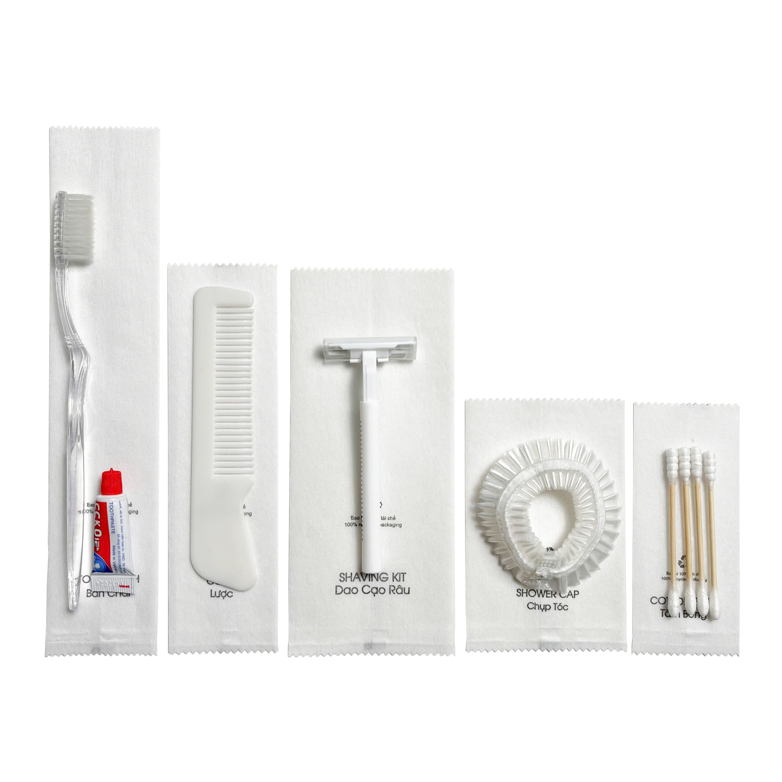 Bộ sản phẩm bao gồm năm món đồ thiết yếu, giúp khách hàng có được trải nghiệm thoải mái trong suốt thời gian lưu trú tại khách sạn. Tất cả đều được đóng gói trong túi vải không dệt chắc chắn, giúp bảo quản sản phẩm tốt hơn và tạo tính thẩm mỹ cao: